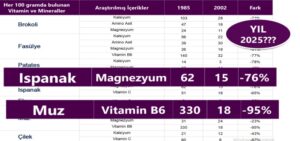 Nitrik oksit salınımını arttırmak için elbette beslenmeye düşen rol büyük. Lakin günümüz koşullarında , azalan toprak verimliliği, pestisitler ve bir çok kimyasal madde yüzünden besinlerden almamız gereken vitamin ve minerali alamıyoruz. Aşağıdaki tablo bunu açıklıyor.